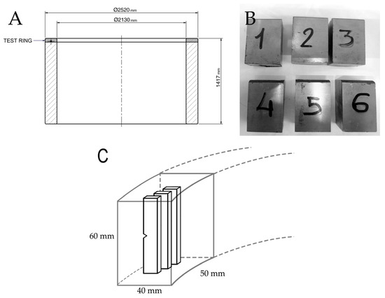Test samples came from a production forging Bush (forging ratio of >4:1 from starting ingot), with dimensions Φ2520 mm × Φ2130 mm × H1417 mm, and weighing about 16 tons. A test ring was cut after heat treatment of the forging bush (austenitization at 890 °C for 4 h, quenching in water, cooling rate approximately 115 °C/s and tempering at 620 °C for 6 h) as reported in Figure 1A, and cut again to obtain samples 60 mm × 40 mm × 50 mm (Figure 1B) to perform heat treatments in lab scale. Standard V-notch impact test samples were machined transversally to the major forging direction, as reported in Figure 1C.