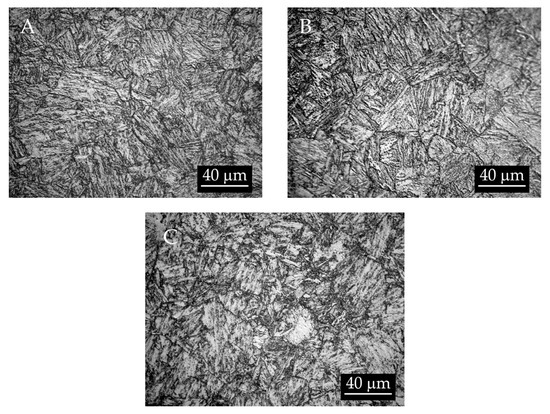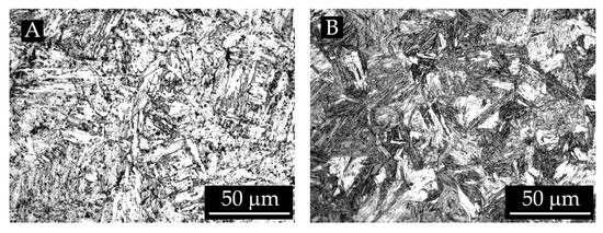 From the micrograph reported in Figure 3A the expected microstructure composed by bainite and tempered martensite in the initial forging can be observed. After quenching (Figure 3B), the microstructure is composed by lath martensite and mixed bainite.
