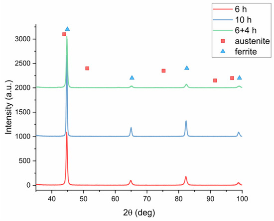 XRD analysis of the samples after different heat treatments: quenched and tempered at 590 °C for 6 h (red line); quenched and tempered at 590 °C for 10 h (blue line); quenched and tempered at 590 °C 6 h + 590 °C 4 h (green line).