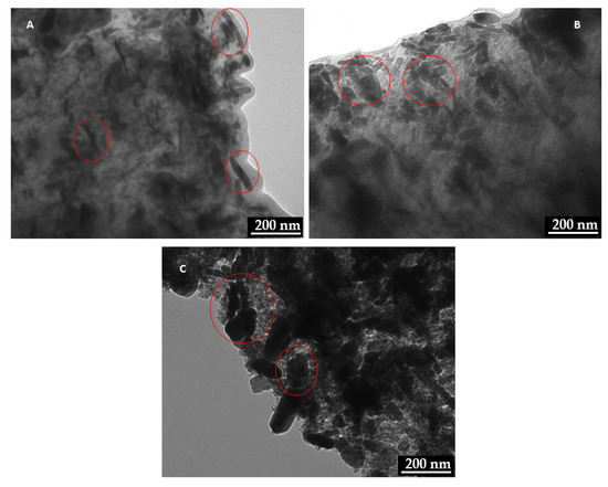 The shape and distribution of carbides can significantly affect the impact toughness. However, due to the small size of carbides, from SEM observation it was not possible to analyze and compare their shapes. In order to further investigate these microstructural features, TEM analysis on the three samples were performed and the results are reported in Figure 9. The images confirm the mainly bainitic microstructure with the presence of mixed upper and lower bainite, with carbides that can be found both inside and along the bainitic plates in addition to the one’s observable at the grain boundaries. Significant variations in the shape of the carbides can be noticed. In detail, in the sample quenched and tempered at 590 °C for 6 h the carbides are lenticular-shaped, as shown in Figure 9A (red circles). Increasing the tempering time to 10 h (Figure 9B) produces an increase in the carbides average dimension, however, keeping an almost lenticular shape. With double tempering 6 h + 4 h (Figure 9C) a more globular shape can be noticed. The evolution in the shape of the carbides (i.e., from lenticular to globular) produces the observed increase in impact toughness. However, the hardness remains constant, despite the increased soaking time or number of steps in the tempering treatment.