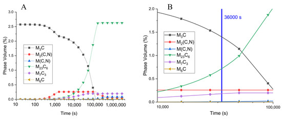 Carbides sequence precipitation was studied for S690 steel with software simulation in the case of quenching at 890 °C and single tempering at 590 °C, and the results are reported in Figure 10.