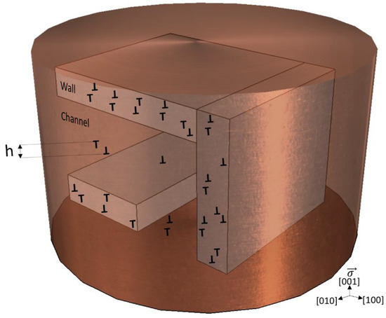 When FCC metals are cyclically deformed along a [001] direction (tension and compression with R = −1), a labyrinth microstructure consisting of dislocation walls and channels (regions with high and low dislocation densities, respectively) develops. The details of these dislocation structures strongly depend on the strain amplitude, crystal orientation, temperature, and number of cycles [1,2,3,4]. The labyrinth microstructure was first observed in a polycrystalline Cu-Ni alloy fatigued in multiple glide by Charsley and Kuhlmann-Wilsdorf [5] and then observed by Jin and Winter [6] for the first time in single crystals in cyclically deformed [001] oriented copper (multiple slip). The purpose of this work is to determine the microstructure of cyclically deformed copper single crystal oriented for multiple slip at ambient temperature along the [001] tensile axis and to measure the dislocation dipole heights across the heterogeneous dislocation microstructure. This will allow for an investigation into the existence of long-range internal stresses (LRIS) in the labyrinth structure. Figure 1 depicts the dipole height, which is the distance between the two slip planes of the dislocation dipole. Understanding LRIS is essential for a variety of reasons including understanding the basis of the Bauschinger effect, spring back in metal forming, and, of course, understanding the plastic deformation of cyclically deformed metals (fatigue) [7,8].