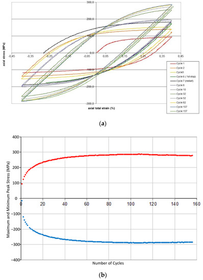 (a) The cyclic deformation of [001]-oriented copper single crystal at ambient temperature. Strains are plastic and elastic. (b) The evolution of the maximum and minimum peak stress with respect to the number of cycles.