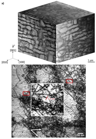 In the current study, the dislocation density in the walls was 8.6 × 1014 m/m3 and the density in the channels was 1.55 × 1013 m/m3 using Equation (2) [22]. In this equation, N is the number of dislocation intersections with a random line of length, L, and t is the thickness of the film, which was determined by electron energy loss spectroscopy.