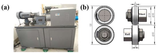 The wear tests were carried out by using a GPM-30 wear machine (Yihua, Jinan, China), as shown in Figure 2a. The sample dimensions and contact mode of the wheel/rail samples are shown in Figure 2b. After the final grinding, the surface roughness value (Ra) of the samples was less than 0.4 μm. The wear tests were to simulate the operation of trains under dry friction condition. In the wear test, the contact stress was 1140 MPa to simulate the 17 t axle load of trains, according to Hertz contact theory [15].