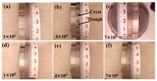 Figure 3 shows the change of surface wear morphology of the ER8 and SSW-Q3R wheel samples at different cycles. It can be seen from Figure 3a,d that two kinds of wheel sample surface were smooth at 1 × 105 cycles. There were no cracks on the surfaces of the samples. When the rolling cycle reached 4 × 105 cycles, the polygonal wear began to form at two kinds of wheel sample surface, as shown in Figure 3b,e. The polygonal wear at the ER8 wheel sample surface was more severe than that at the SSW-Q3R wheel sample surface. The ER8 wheel sample surface also formed the crest and trough all the way around. However, there were no crests and troughs in the half circle of the SSW-Q3R wheel sample. At 7 × 105 cycles, the degree of polygonal wear for the two kinds of wheel sample was similar (Figure 3c,f). All surfaces of the wheel sample formed a crest and trough all the way around.