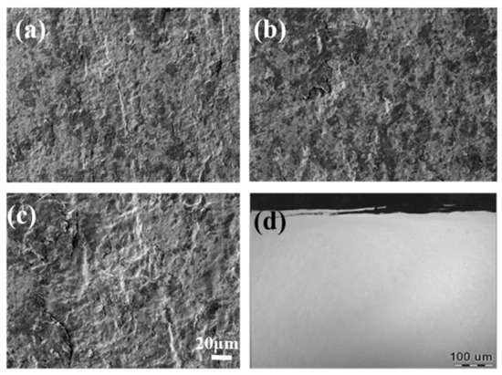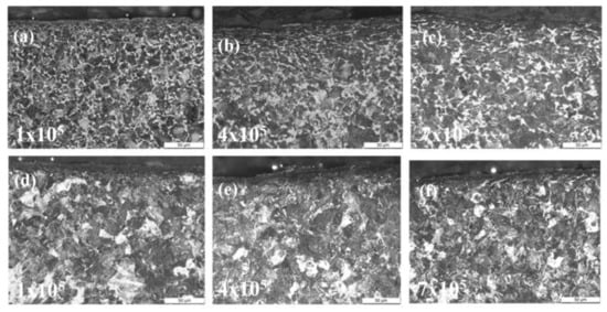 Figure 7 shows the optical microscope (OM) micrographs of the ER8 and SSW-Q3R wheel samples with different cycles. After rolling wear, two kinds of sample surface formed a certain thickness of plastic deformation layer. After wear with 1 × 105 cycles, the thickness of the plastic deformation layer of the ER8 wheel sample was about 20 μm. However, for the SSW-Q3R wheel sample, it was only about 10 μm. With the increase in cycles, the thickness of the plastic deformation layer gradually increased. At 4 × 105 cycles, the thickness of the plastic deformation layer of the ER8 and SSW-Q3R wheel samples reached around 30 μm and 20 μm, respectively. When the rolling cycle was operated to 7 × 105 cycles, the thickness of the plastic deformation layer of the ER8 wheel sample further increased to 40 μm, and the thickness of the plastic deformation layer of the SSW-Q3R wheel sample was about 30 μm.