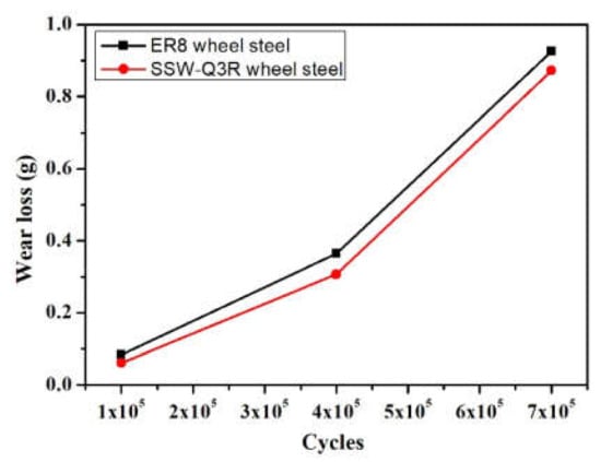The variation of wear loss of the ER8 and SSW-Q3R wheel samples with different cycles is shown in Figure 5. With the increase in cycles, the wear loss of the wheel samples was increased. At 1 × 105 cycles, the difference of wear loss of the two kinds of wheel samples was not obvious. At 4 × 105 cycles, the wear rate of wheel samples was high. Moreover, the obvious difference of wear loss was formed. The wear loss of the ER8 wheel sample was obviously higher than that of the SSW-Q3R wheel sample. The reason could be that the ER8 sample surface formed severe polygonal wear all the way around to increase the wear loss, as shown in Figure 3b. At 7 × 105 cycles, the wear loss of the ER8 wheel sample was also higher than that of the SSW-Q3R wheel sample. The wear rate of the wheel samples was similar to that at 4 × 105 cycles.