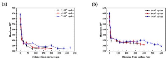 The change in surface wear morphology and wear loss is related to the evolution of surface hardness and surface microstructure. The surface hardness of the ER8 and SSW-Q3R wheel samples with different cycles was measured, as shown in Figure 6. The surface hardness of wheel samples increased as the number of cycles increased. At 1 × 105 cycles, the surface hardness of the ER8 and SSW-Q3R wheel samples was 500 HV and 550 HV, respectively. As the cycle increased to 4 × 105 cycles, the surface hardness of the ER8 and SSW-Q3R wheel samples reached 530 HV and 600 HV, respectively. When the cycle reached 7 × 105 cycles, the surface hardness of the ER8 and SSW-Q3R wheel samples increased to 530 HV and 600 HV, respectively. At different cycles, the surface hardness of the ER8 wheel sample was always lower than that of the SSW-Q3R wheel sample. High hardness of the SSW-Q3R wheel sample improved the wear resistance. Therefore, the wear loss of the SSW-Q3R wheel sample was low (Figure 5). The carbon content of the SSW-Q3R wheel sample was higher than that of the ER8 wheel sample. During the rolling wear process, the surface lamellar cementite will be fragmented and dissolved due to the surface friction stress, so can increase the surface hardness of the wheel samples [18]. It can be seen from Figure 6b that the hardening layer thickness of the ER8 wheel sample was higher than that of the SSW-Q3R wheel sample as the content of proeutectoid ferrite of the ER8 wheel sample was higher than that of SWW-Q3R wheel steel, which led to the thicker plastic deformation layer.