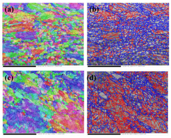 The EBSD maps of the wheel samples at the depth of 10 μm from the surface at 7 × 105 cycles (red line is the low angle grain boundary, 2° < θ < 10°; blue line is the high angle grain boundary, θ > 10°). (a,b) ER8 wheel steel, (c,d) SSW-Q3R wheel steel.