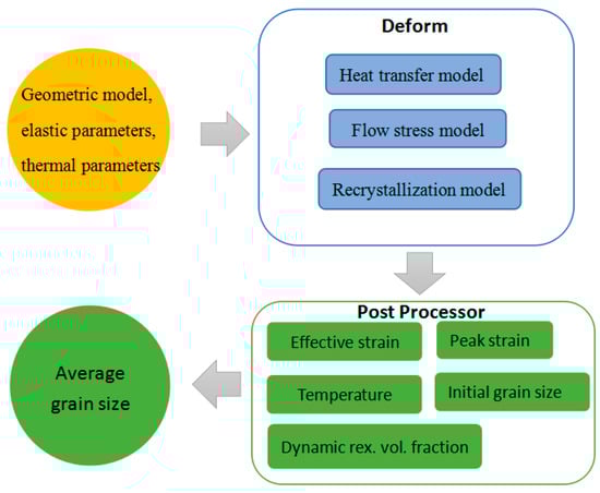 Figure 1 shows the flowchart of the simulation process. Firstly, the two-dimensional rolling geometry model of aluminum plate was established. Subsequently, the heat transfer model, flow stress model, recrystallization model, material properties, and the movement of rollers were set up. At last, effective strain, peak strain, temperature, initial grain size, and dynamic recrystallization fraction can be obtained from the simulation.