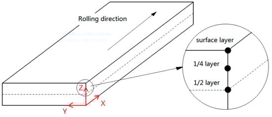 Aluminum alloy 7050 is widely used in aerospace industries because of its high strength and fracture toughness, low density, and good corrosion resistance [,,,]. Generally, the manufacturing processes of aluminum alloy include smelting, casting, rolling, cutting, and so on. Rolling can reduce or eliminate the casting defects and improve the mechanical properties of the alloy. However, when the aluminum alloy 7050 material was rolled into plates of a certain thickness, the overall mechanical properties of the plates are often lower than those of the small pieces in the trial production, showing obvious inhomogeneous properties, which greatly affects its subsequent performance. Therefore, it is very important to study the inhomogeneity of the mechanical properties’ distribution of 7050 aluminum alloy thick plate and the causes of its occurrence, so as to improve its mechanical properties.