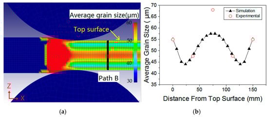 Distribution of average grain size in thickness direction of hot rolled plate. (a) FEM model of thick plate hot rolling; (b) distribution of average grain size.