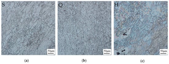 Twenty sampling points at a spacing of 7.5 mm on path B (a through thickness path at the center of the length and width of the rolling plate) were selected for average grain size analysis, as shown in Figure 4a. The average grain size shows a W-shaped symmetrical distribution along path B, as shown in Figure 4b. The grain size from the surface layer to the center layer decreased firstly and then increased gradually. According to the experimental result, the actual average grain sizes of the S, Q, and H layer were 54.93 μm, 47.64 μm, and 67.97 μm, respectively. The microstructures of the S, Q, and H layer were shown in Figure 5, which shows that the grain size of Q layer is smaller than S and H layer, which is in agreement with the simulation result. In order to calculate the simulated yield strength, the relation between the grain size and the thickness obtained by the simulation can be expressed as Equation (1) ranging from S layer to H layer.