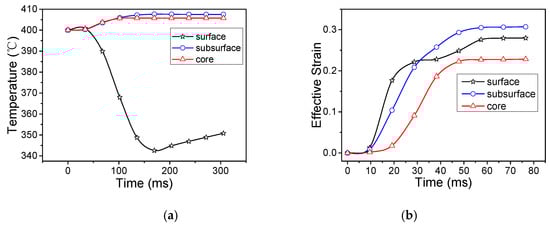 It can be seen from Figure 6a that the temperature history of different layers of the plate was quite different during the rolling process. With the rolling process, the surface layer temperature rapidly dropped, because the surface layer of the plate was in direct contact with the rollers, the heat exchange increased and the temperature dropped significantly. On the contrary, the temperature of the subsurface layer and core layer raised in the early stage of rolling, as there was heat generated by plastic deformation without other energy loss. The reason temperature rise of the subsurface layer was larger than that of the core layer in the early stage of rolling is because more deformation heat was generated when the deformation of the subsurface layer was larger than that of the core layer (Figure 6b).
