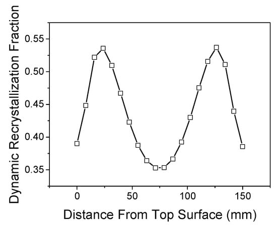 Furthermore, 20 sampling points at a spacing of 7.5 mm on path B were selected for dynamic recrystallization fraction analysis, and the result is shown in Figure 7. It can be seen from Figure 7 that the dynamic recrystallization fraction of different thickness layers is different due to the uneven temperature field and strain field of the plate during the rolling process, which shows a M-shaped symmetrical distribution along path B. Dynamic recrystallization is affected by the critical strain value, while a high temperature will reduce the critical strain value, which is conducive to the dynamic recrystallization. Recrystallization in the sub surface of the plate is most sufficient due to higher temperature and larger deformation. Recrystallization degree of the thick plate thickness center is the smallest, as deformation is difficult to penetrate into the center.