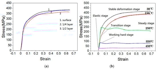 True stress-strain curves. (a) Compression specimens of different layers at room temperature; (b) compression specimens of surface layer at different temperatures.