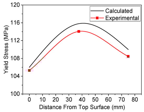 Based on the results of the hot compression test, the strength distribution in the thickness direction of the aluminum alloy 7050 rolled plate can be plotted, as shown in Figure 9. In addition, it includes the yield strength that was calculated with the grain size fitting Equation (1) from the simulation. It can be seen that the yield strength increases first and then decreases from the surface layer to the core of the plate, and the yield strength reaches a maximum near the 1/4 layer. In terms of inhomogeneity, the experimental and simulation results both reflected that the mechanical properties of the material thickness have a greater relationship with the grain size distribution. Liang Zhou proposed the concept of inhomogeneity of performance by using the relatively extreme yield strength in the thickness direction []. Based on this, the relationship between the grain size and the inhomogeneity of the mechanical properties was established, and a method for measuring the inhomogeneity of the mechanical properties in the thickness direction of the aluminum alloy 7050 rolled plate was proposed.