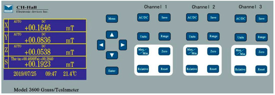 The three-dimensional periodic magnetic field inside mold of a vertical, round bloom caster was measured. As shown in Figure 1, the measuring instrument was the model 3600 digital, high-precision, three-dimensional Gaussian meter (CH-HALL, Beijing, China) with the low frequency alternating magnetic field acquisition module. The parameters of measuring instrument are shown in Table 1.