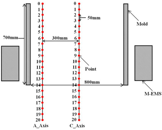 When the current intensity of M-EMS (VAI, Linz, Austria) was 400 A and the current frequency was 3 Hz; the three-dimensional periodic magnetic fields of A_axis and C_axis were measured in the mold. C_axis was the central axis of mold, and A_axis was 300 mm apart from C_axis. Figure 2 shows the measuring points inside the mold under the action of M-EMS. In the space range of 1000 mm inside the mold, the magnetic field in XYZ directions is measured at 50 mm intervals, and 21 measuring points on each axis.