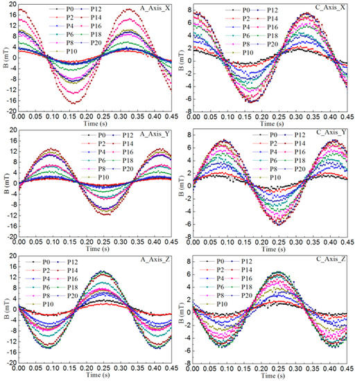 Figure 3 shows the measurements of the XYZ, three-dimensional, periodic magnetic fields of A_axis and C_axis, which can show the periodic variation law of the magnetic field in XYZ directions at each point. Comparing the XYZ, three-dimensional, periodic magnetic field CmplxMag at each point, the electromagnetic model of large-bloom continuous casting was verified.