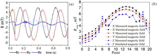 Figure 5a shows the measurements of the XYZ, three-dimensional, periodic magnetic field at P16 of A_axis, and the XYZ, three-dimensional, periodic magnetic field CmplxMag is 6.0, 5.5 and 1.0 mT respectively. The XYZ, three-dimensional, periodic magnetic field CmplxMag of each point was integrated to obtain the comparison diagram of measured magnetic field CmplxMag and simulated magnetic field CmplxMag, as shown in Figure 5b. It can be seen that the maximum value of the magnetic field CmplxMag is P14, not P10, which is consistent with the maximum value of the magnetic flux density at the lower edge of the mold. The simulated magnetic field distribution is basically consistent with the measured magnetic field distribution, which verifies the accuracy of the electromagnetic model.
