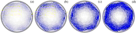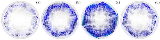 The distributions of magnetic lines under different current intensities: (a) I = 200 A, f = 3 Hz; (b) I = 300 A, f = 3 Hz; (c) I = 400 A, f = 3 Hz; (d) I = 500 A, f = 3 Hz.