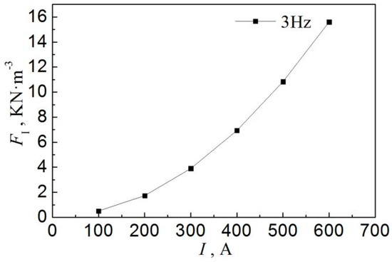 The distributions of magnetic lines under different current intensities in the round bloom are shown in Figure 8. When the current frequency of M-EMS is 3 Hz, the current intensity increases from 100 to 600 A; the relationship between current intensity and electromagnetic force is shown in Figure 9. It can be seen that the electromagnetic force increases with the increase of the current intensity [14,15].