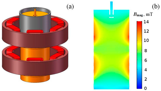 The structural diagram of bipolar electromagnetic stirring (a), and the contour plot of the magnetic flux density in the longitudinal section (b).