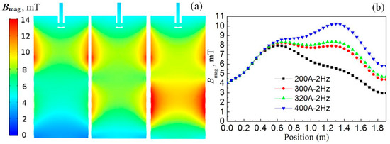 When the current frequency of M-EMSA is 2 Hz, the current intensity is 400 A; when the current frequency of M-EMSB is 2 Hz, the current intensity is 200–400 A, and the distance between the poles is 400 mm. The distributions of magnetic fields under different current intensities of M-EMSB are shown in Figure 11a. With the increase of current intensity of M-EMSB, the internal magnetic field intensity of M-EMSA gradually increases, and the middle region is gradually filled by magnetic field. In the space range of 1900 mm inside the mold, the measurement interval is 50 mm, and Figure 11b shows the magnetic flux density values of C_axis under different current intensities. The unsuitable current intensity of M-EMSB is not conducive to the uniform distribution of the magnetic field. When the current intensity of the M-EMSB is 320 A, the magnetic field is evenly distributed in the round bloom, the intensity of uniform magnetic field is 8 mT and the range of action is 1.2 m high.