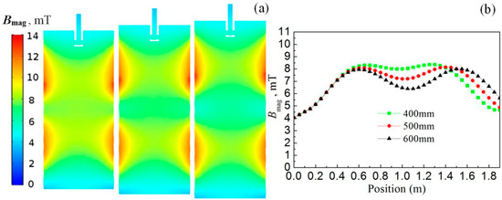 When the current frequency of M-EMSA is 2 Hz, the current intensity is 400 A; when the current frequency of M-EMSB is 2 Hz, the current intensity is 320 A, and the distance between the poles is 400–600 mm. The distributions of the magnetic field under different distances are shown in Figure 12a. It can be seen that with the increase of the distance between the poles, the low-intensity magnetic field appears at the center of the magnetic field. The range of the low-intensity magnetic field increases with the increasing distance, which affects the uniformity of magnetic field. In the space range of 1900 mm inside the mold, the measurement interval is 50 mm, and Figure 12b shows the magnetic flux density values of C_axis at different distances. When the distance between the poles is 400 mm, there is a uniform magnetic field distribution in the round bloom.