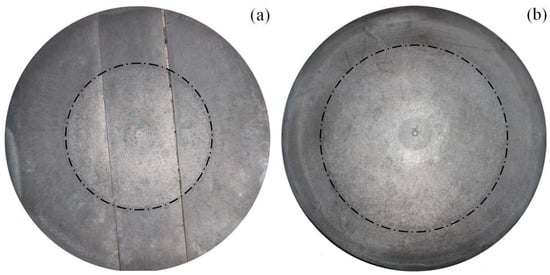 The macrostructure of 42CrMo Φ 800 round bloom. M-EMS is 2 Hz and 400 A (a). Upper mold electromagnetic stirring (M-EMSA) is 2 Hz and 400 A; M-EMSB is 2 Hz and 320 A (b).