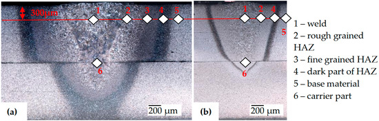 The tensile shear strength of the weld joint was tested using a Z250 tensile testing machine (Zwick, Ulm, Germany) with a maximum up to 250 kN load, in accordance to standard EN ISO 6892-1:2009. Three test-tubes of standard dimensions were used for the test (Figure 1b). The hardness was measured on all samples using the Vickers method with load of 5 kg (HV5) at different parts of the weld and HAZ using a Zwick 3212 machine. The hardness was measured on the weld face 300 μm from the top edge of the surface (Figure 2), on the following spots: 1-weld, 2-rough grain in the HAZ, 3-fine grain in HAZ, 4-dark part of the HAZ, 5-at the interface between dark part/base metal, 6-and load bearing part of the weld (border between two steel sheets). The macroscopic and microscopic analysis was conducted using an Axiolab light optical microscope (ZEISS, Oberkochen, Germany) equipped with an Axio Cam Mrc 5 camera and Dhs processing software. Etching was done using a 2% HNO3 in ethanol (nital) agent.