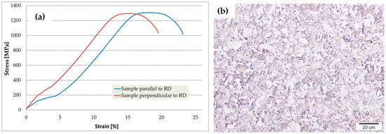 Properties of Docol 1200 U/AHHS in as-delivered condition; (a) engineering stress-strain diagram of the specimens sectioned parallel and perpendicular to the rolling directions, (b) microstructure of the “as-delivered” condition.