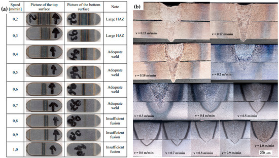 Figure 4a shows face and root side of the weld with the HAZ for experimentally welded specimens. The results of the top weld surface show that at higher welding speeds i.e., at smaller heat input, the weld width and HAZ width are smaller. Visual examination of the bottom side pictures reveals that welding speeds slower than 0.2 m/min enable weld penetration over both steel plates. Welding speeds slower than 0.7 m/min produces visible HAZ at the root side of the bottom steel plate. At higher welding speeds the heat input is too low to produce oxidation at the root side of the bottom plate, thus indicating the presence of insufficient fusion.