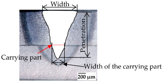 Tensile-shear strength (τ) was calculated from maximum force (Fmax) at the breakage and measured cross-section surface S of the broken weld (Equation (2)), using a light optic microscope (Figure 5).