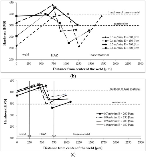 The average hardness of the base material in the as received condition was 400 HV5. Hardness results in relation to the distance from the centre of the weld for different welding speeds are depicted in Figure 6.