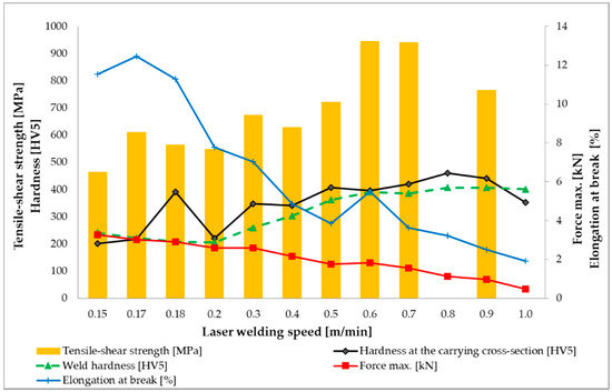 The calculation of tensile-shear strength showed that the highest tensile-shear strength of the joint was reached at welding speed of 0.6 m/min and it was 945 MPa, which is consistent with the results of other authors [13,23]. In that study the shear strength of the joint achieved 90% shear strength of native material and meet the strength criteria according to PN-EN ISO 14273:2016.