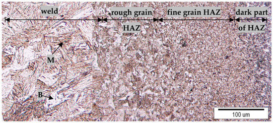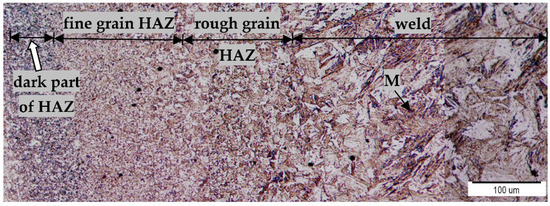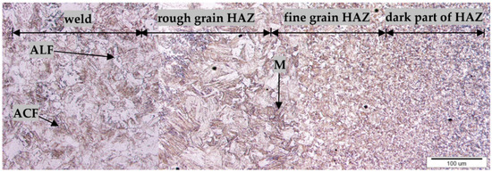 Figure 8 shows a microstructure of the weld obtained at the welding speed of 0.2 m/min, where in the microstructure of the weld ferrite (ALF, ACF) prevails, but there are also bainitic and martensitic grains present. Grains in the rough part of the HAZ are approximately 30 μm large and inside of them martensite is present. On the right site of Figure 8 fine martensitic grains and darker part of HAZ are shown, where proeutectoid ferrite and martensitic grains can be seen.