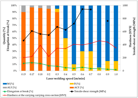 In this research we came to the conclusion that martensitic microstructure is precipitated in the weld of martensitic high strength steel at the welding speed of 0.6 m/min. At lower welding speeds there is also acicular and allotriomorphic ferrite precipitated along with the martensitic microstructure. Similar microstructures were observed by other authors that investigated the welding of AHSS [13,18,23,26]. The quantity of ACF and ALF increases as the welding speed decreases and they prevail at speeds lower than 0.2 m/min. With quantity of ACF, ALF, B and M, hardness and tensile-shear strength as well as elongation at break point are changing. By decreasing linear energy input (i.e., increasing welding speed) microstructure is changed into more martensitic due to higher cooling speed of the weld. This microstructure has higher hardness and tensile-shear strength, while the elongations are smaller.