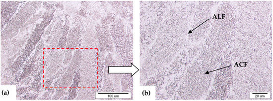 Metallographic examinations clearly confirmed that specimens welded with lower welding speed with higher linear heat input have microstructure with acicular (ACF) and allotriomorphic ferrite (ALF). ACF is clearly evident in the root of the weld processed at speed of 0.18 m/min. (Figure 12). Magnified view in Figure 12b depicts that ALF precipitated along the crystal boundaries of ACF.