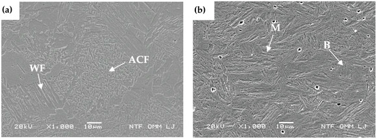 The welds at carrying cross section for welding speeds 0.2 m/min and 0.6 m/min were examined using a JSM-5610 Scanning Electron Microscopy (SEM, Jeol, Tokyo, Japan) microscope equipped with EDS microanalysis hardware. Microstructure of the weld welded with the speed of 0.2 m/min is mostly acicular ferrite (ACF) with a small amount of widmanstätten ferrite (WF, Figure 13a), whereas the microstructure of the weld welded with the speed of 0.6 m/min is martensitic (Figure 13b). Microstructural results obtained in our study are consistent with those reported by other authors [13,18,23,26] concerning the application of laser welding of AHSS steels.