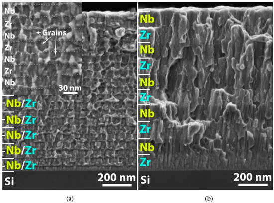 Cross-section SEM images of the as-deposited Zr/Nb nanoscale multilayer coatings (NMCs): 25/25 nm (a) and 100/100 nm (b).