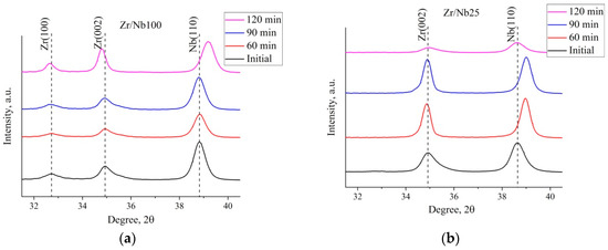 In the case of Zr/Nb100 multilayers (Figure 3a), no peak shift was observed up to 90 min of irradiation, whereas after 120 min of irradiation, diffraction peak shifts to a lower 2θ angle (for Zr) and to a higher 2θ angle (for Nb) occurred. In contrast for Zr/Nb25 multilayers (Figure 3b), Zr diffraction peaks remained stable at all irradiation times, and Nb diffraction peaks shifted remarkably to a higher 2θ angle over 90 min of irradiation. After reaching 120 min, no peak shifting was observed. The observed variations in the position of diffraction peaks indicate a change in interplanar spacing (d-spacing) and the presence of residual stresses on a scale larger than the grain size (macrostresses). The d-spacing was calculated using Bragg’s equation:
