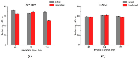 The dependence of resistivity on irradiation time showed that there was no increase in resistivity of the Zr/Nb NMCs after irradiation (Figure 6a,b). For Zr/Nb100 irradiated for 60 min and 120 min, decreases in resistivity of 10% and 26% were detected, respectively. For Zr/Nb25, no apparent changes in electrical resistivity were noted. Hence, the concentration of defects in the irradiated samples was the same or lower than in unirradiated ones, proving the recovery process during irradiation.