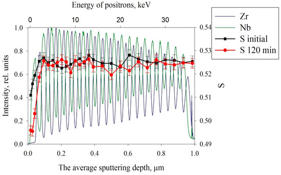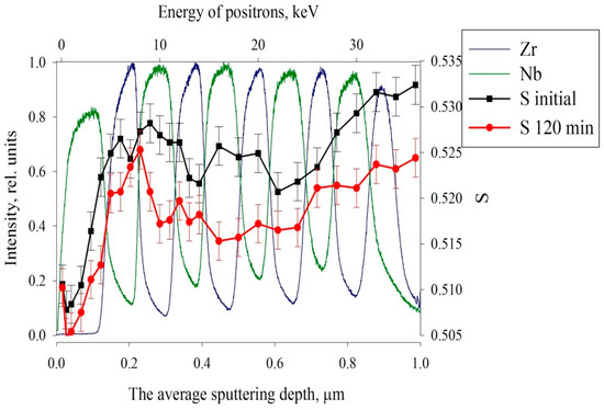 When analyzing coatings by the GD-OES method, a layer-by-layer correlation of data with beam positron spectroscopy was discovered, which led us to consider these results in more detail. Figure 9 shows graphs of the dependence of the Zr and Nb emission intensity on the sputtering depth of the initial sample with a coating of 100 ± 10 nm and the relationship of the positron energy with the S parameter of the initial and irradiated samples. The results obtained by GD–OES were in good agreement with the results of the positron beam spectroscopy. One can note a certain tendency: during the sputtering of the niobium layer, the S parameter increased, and during the sputtering of the zirconium layer, the S parameter decreased. Furthermore, this cycle was repeated throughout the entire measurement range; this behavior of the S parameter was caused by different lattices of these metals. Hence, peaks and drops began at the layer interface, as confirmed by the results of GD–OES.