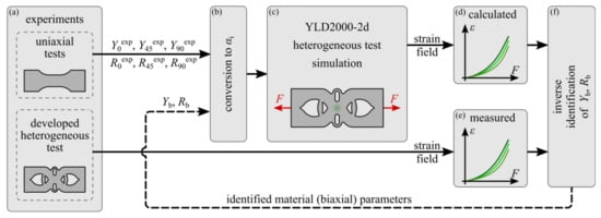 The proposed methodology is schematically presented in Figure 1. The left box (a) presents the tests to be performed. The outputs of these tests are the normalized uniaxial stresses, the R-values and the strain fields measured from the heterogeneous test. Together with the initial guesses for , the experimental values of and are inserted in the conversion algorithm (b), which yields YLD2000-2d parameters (see Section 2.2). These parameters are delivered in the numerical simulation of the conducted heterogeneous test (c). The output of the numerical simulation is strain field response at the centre of the specimen (d), which is compared with the experimental data (e) during the minimization procedure (f). New values of are then returned to the conversion algorithm (b) and the procedure is repeated to minimize the discrepancy between measured and simulated responses.