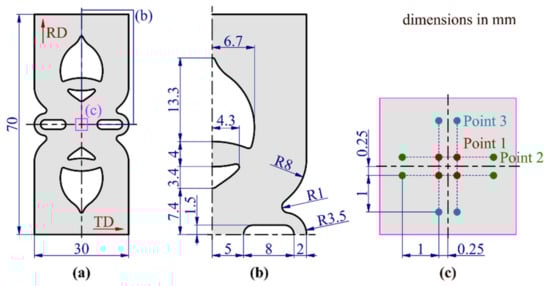 The heterogeneous test specimens were cut using a wire electrical discharge machining process, where the specimens were cut in the rolling direction. To avoid excessive roughness and heat generation, which may influence the material properties, the cutting speed was 0.5 mm/h whereas the diameter of the cutting wire was 0.2 mm. The specimens are designed for use on a uniaxial tensile machine, therefore the geometry of the clamping part of the specimen is equal to the standard uniaxial tensile test. During the test, quasi-static loading conditions were imposed by tensile machine crosshead speed set equal to 0.01 mm/s and loading force measured with a 50 kN loading cell. The logarithmic surface strain field is measured at the centre of the specimen using a DIC optical system Q-400 Dantec Dynamics GmbH, (Ulm, Germany). The force measurement was synchronized with the acquisition of DIC images. The parameters of the optical measuring system are presented in Table 1.