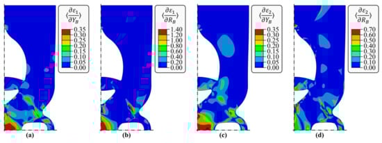 It is worth noting that the relative sensitivity of maximum principal strain to variation in (Figure 3b) yields a value greater than one because variation in in the biaxial state is larger than the variation in in the uniaxial tensile test. It should also be noted that the maximum sensitivity in Figure 3c,d is located in the vicinity of the horizontal notch because the notch influences the principal stress direction, which means that is pronounced.