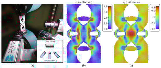 Figure 4a presents the optical measurement system setup with multi-cam configuration, which is focused in the field of view 25 mm × 21 mm. In Figure 4b,c principal logarithmic strain fields and are presented, which are, for demonstration purposes only, measured over a larger field of view than finally selected (25 mm × 21 mm field of view). As shown, the fields are relatively homogeneous in the centre of the specimen, which means that the measurements are potentially less sensitive to strain location error. Based on this information, the principal strain fields and were measured in twelve acquisition points (cf. Figure 2c), which served in the inverse identification procedure. The measured force–strain responses are reported in the next section.